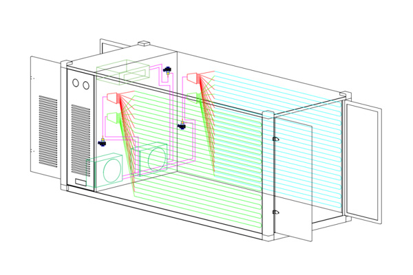 采用無(wú)風(fēng)干式毛細(xì)輻射恒溫系統(tǒng)人均勻的輻射到整個(gè)方艙,避免局部區(qū)域形成溫差,解決方艙內(nèi)部恒溫,自動(dòng)調(diào)節(jié)方艙內(nèi)部空氣、二氧化碳含量,系統(tǒng)運(yùn)行比傳統(tǒng)空調(diào)節(jié)能30%以上。