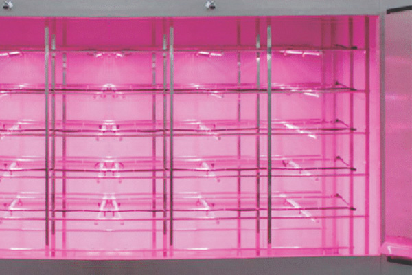 “完全不用陽(yáng)光”、在每個(gè)栽培架上都裝有一塊燈板。LED燈板以紅燈為主,中間按一定距離均勻分布著藍(lán)燈,比例大概為8∶1到9∶1,兩種燈光都能滿足植物生長(zhǎng)的需要。